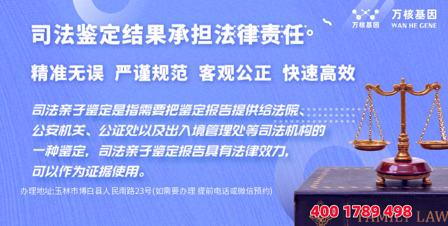 博白司法dna亲子鉴定办理地址:玉林市博白县人民南路23号(如需要办理 提前电话或微信预约)-预约电话:4001789498,博白亲子鉴定基因检测中心的服务范围涵盖了广义的亲子鉴定、DNA验证、亲子鉴定证明等等,对于司法dna亲子鉴定,鉴定结果可以用做司法用途(上户口、办移民、打官司等),也可以作为法庭上的呈堂证供。
